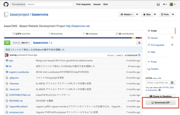 今回はVagrantで仮想環境を構築するため、GitHubの公式リポジトリGitHubの公式リポジトリからzipをダウンロードしてきます。(Gitを日常的に使っている方なら、リポジトリをローカル環境にクローンする方法でも構いません)